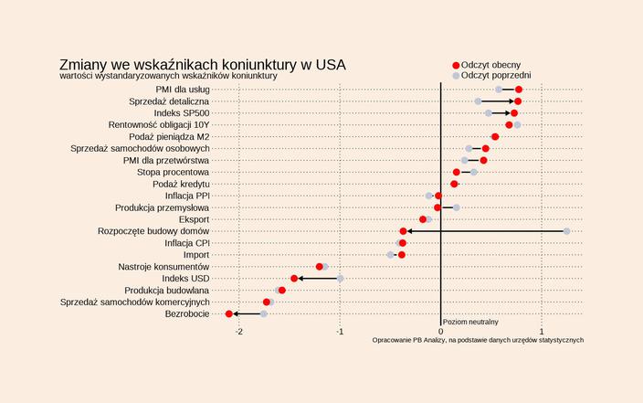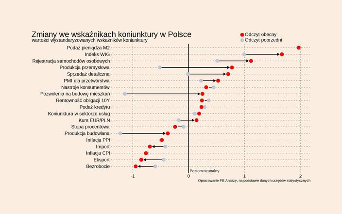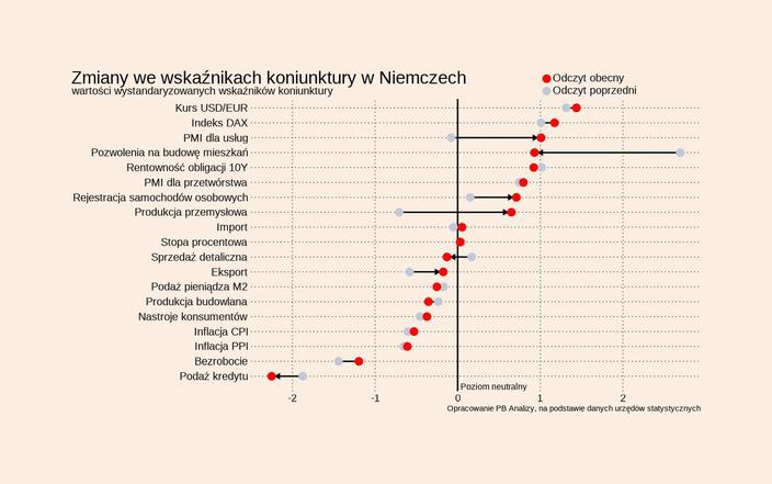 Semanalmente, atualizamos nossos dados sobre o estado da economia global sob a perspectiva de 80 indicadores de quatro países: Polônia, Alemanha, Estados Unidos e China. Esses indicadores incluem dados sobre produção e vendas, bem como sobre os mercados financeiros, com o objetivo de refletir a situação e o sentimento econômico atuais. Todos os dados analisados ​​podem ser visualizados e baixados em nossa plataforma PB Analizy.